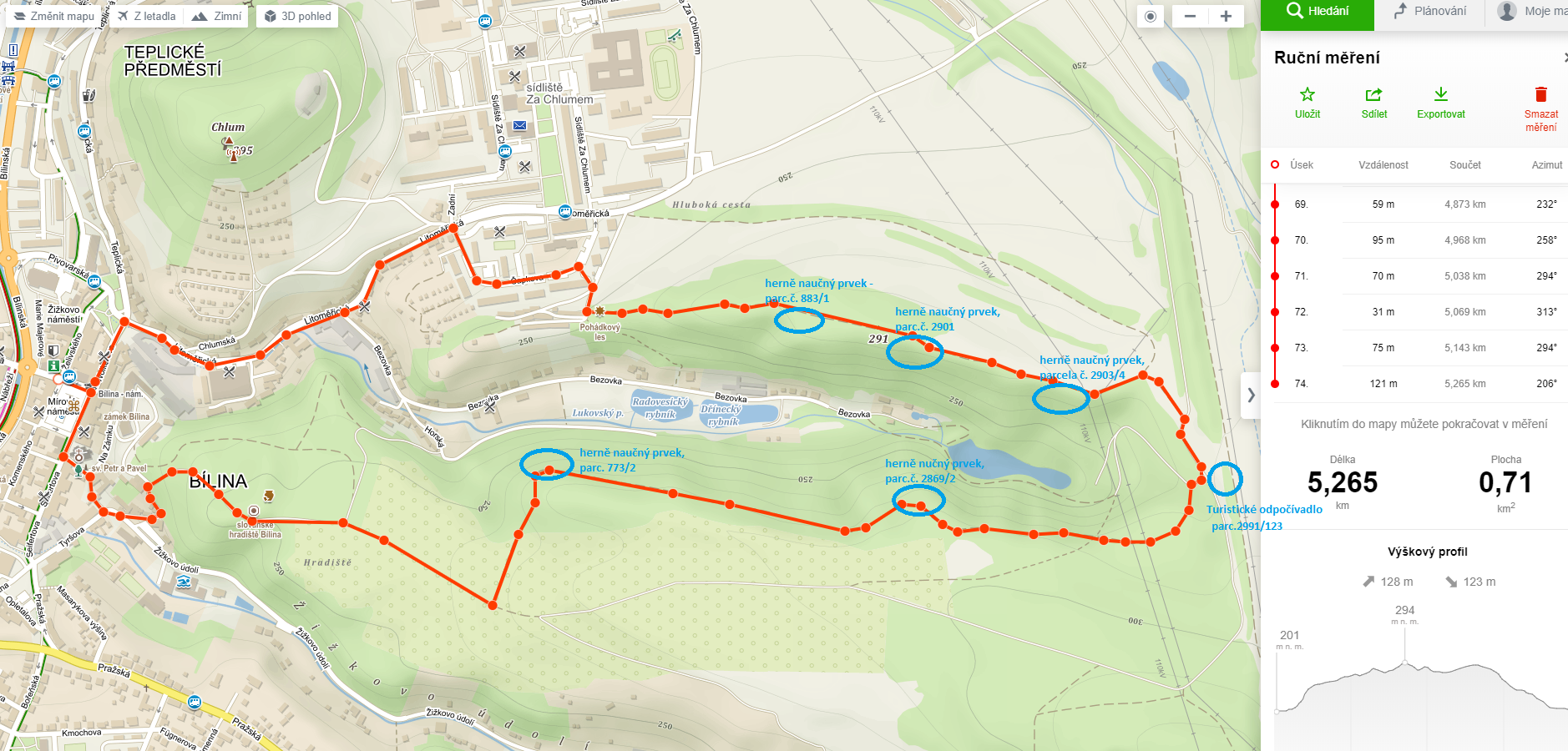 | Název: | Mapa plánované stezky s přibližným umístěním prvků |